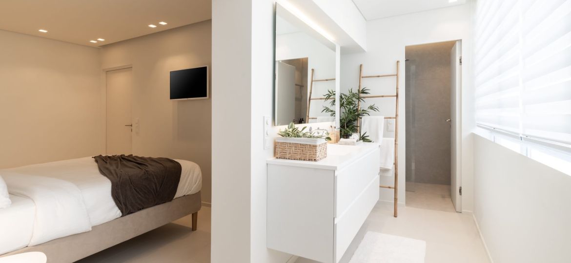 Inside, the apartment features two bedrooms, each with their own bathroom for added privacy. The first bedroom offers a king size bed, a 32’’ 4K HD smart TV with Netflix, 2 air-conditioning units, and a luxurious rainfall shower. The second bedroom boasts a queen size bed, an AC, a 32’’ 4K HD smart TV with Netflix, and a spacious walk-in shower.