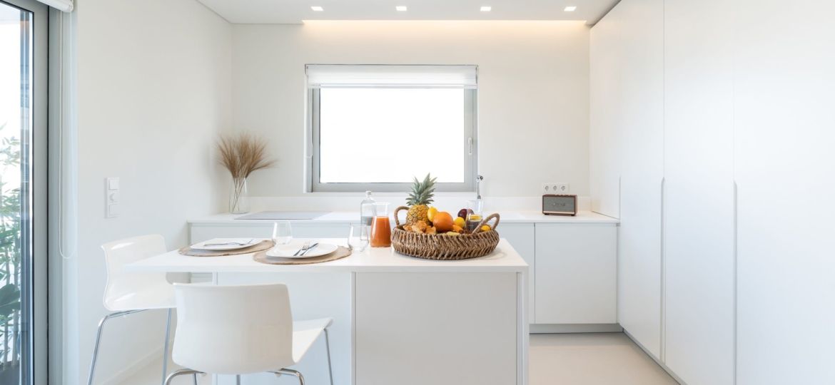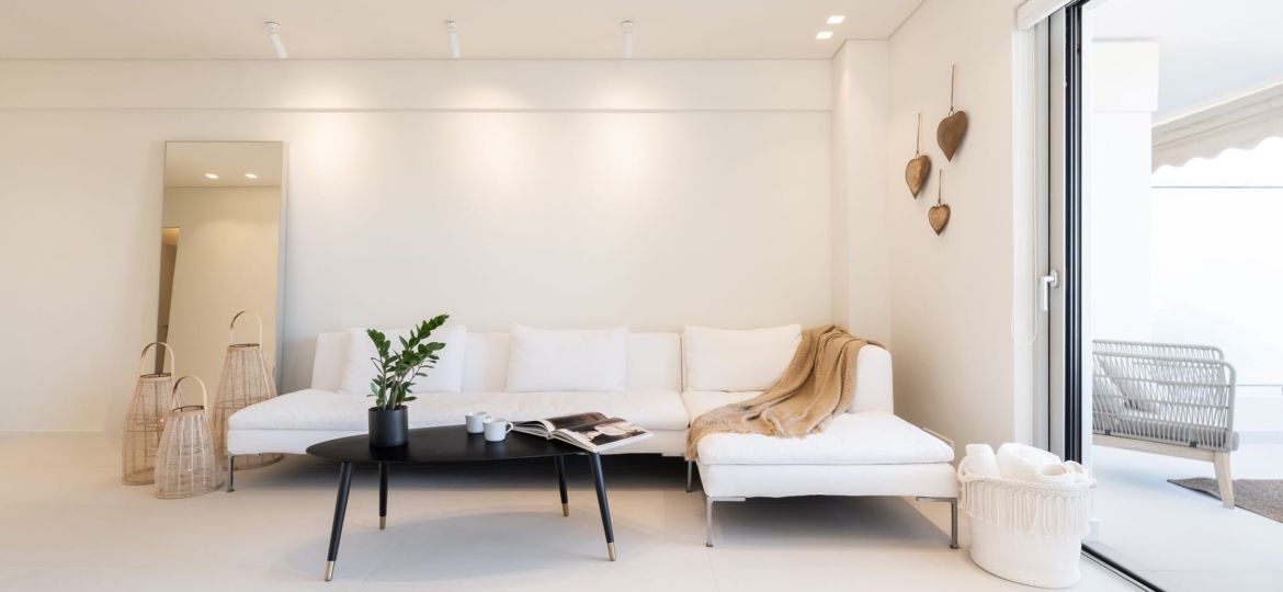 The living room is equipped with an additional AC unit and a 42’’ 4K HD smart TV with Netflix, situated across from a comfortable corner sofa. The fully equipped kitchen includes a dishwasher and a kitchen window with breathtaking sea views.