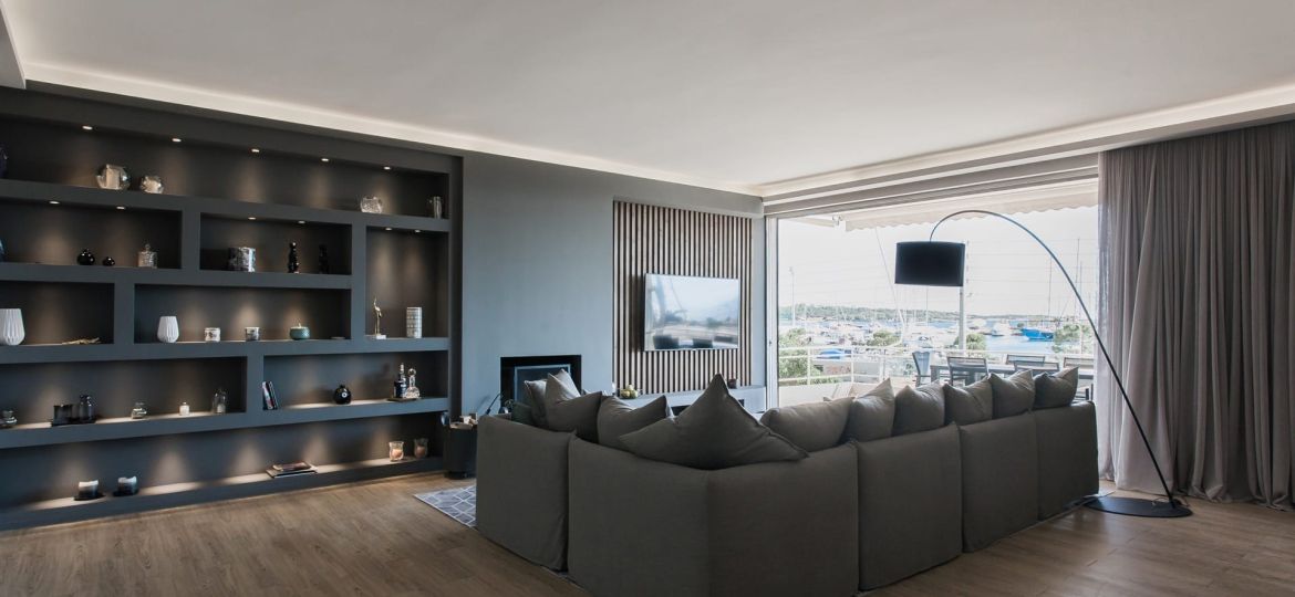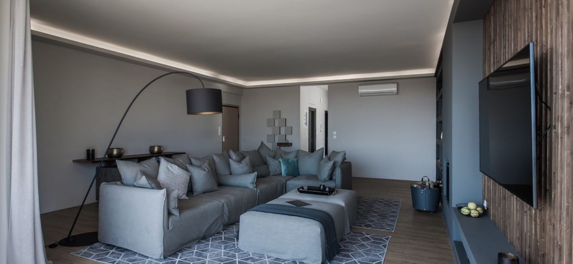 A quiet and exclusive escape from the vibrant Athenian life, lounge choices are aplenty in this modern and minimalistic residence. Choosing between the chic indoor L-shaped sofas and the lounge chairs on the main balconies (with head-on glistening sea views) will be tough.