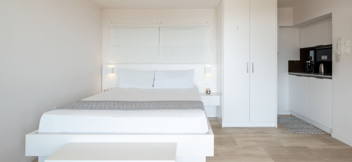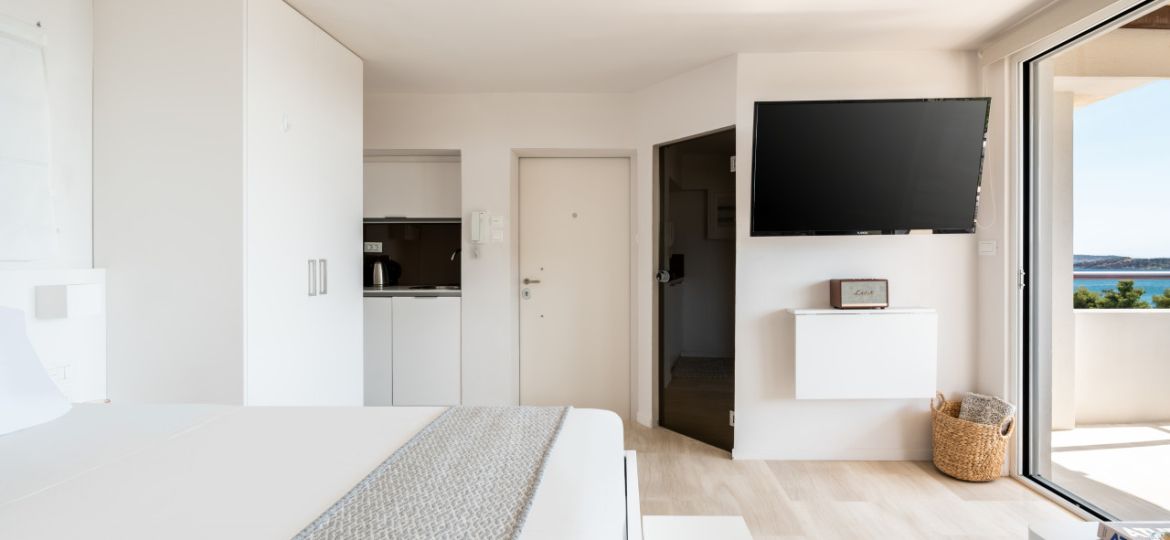This property has one of the best sea views in the Athenian riviera. It features a comfortable double bed with high quality mattress and a huge 55′ TV set with satellite connection.