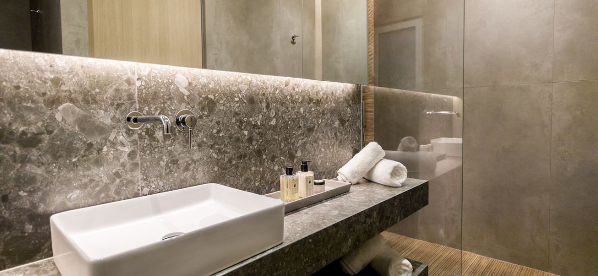 Luxurious marble bathroom, modern simplicity & functionality, clean décor, big sized closet.