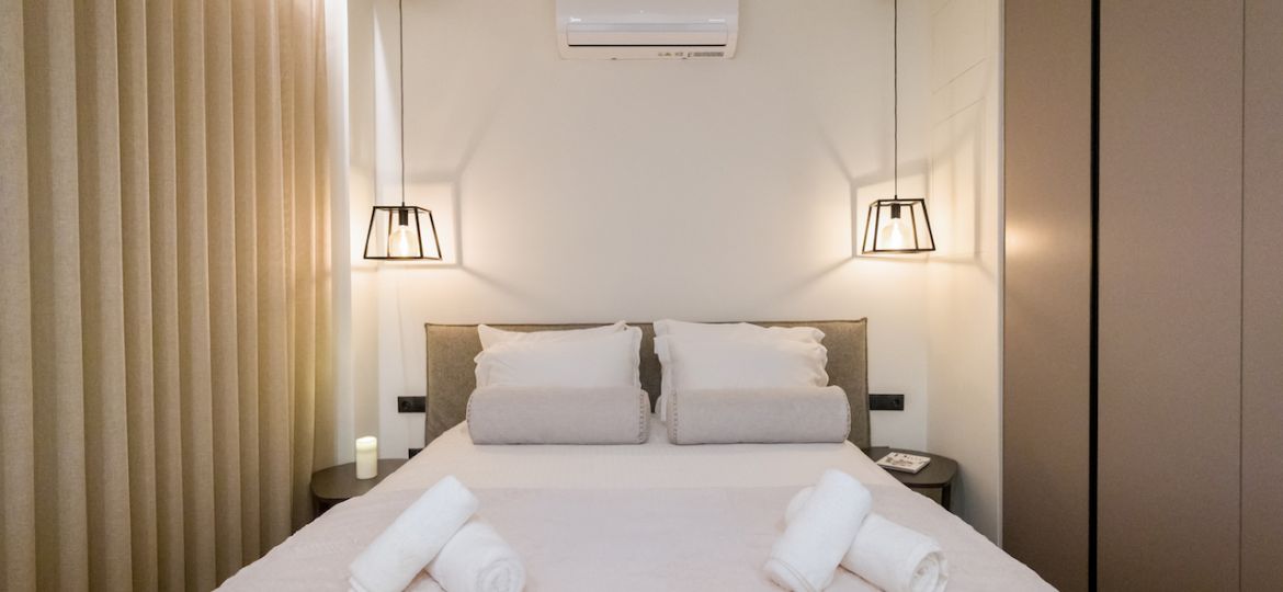 Bedroom: Queen size bed, Air conditioning, spacious wardrobe, 35’’ 4KTV with Netflix bathroom with stand-alone rain shower, direct balcony access.