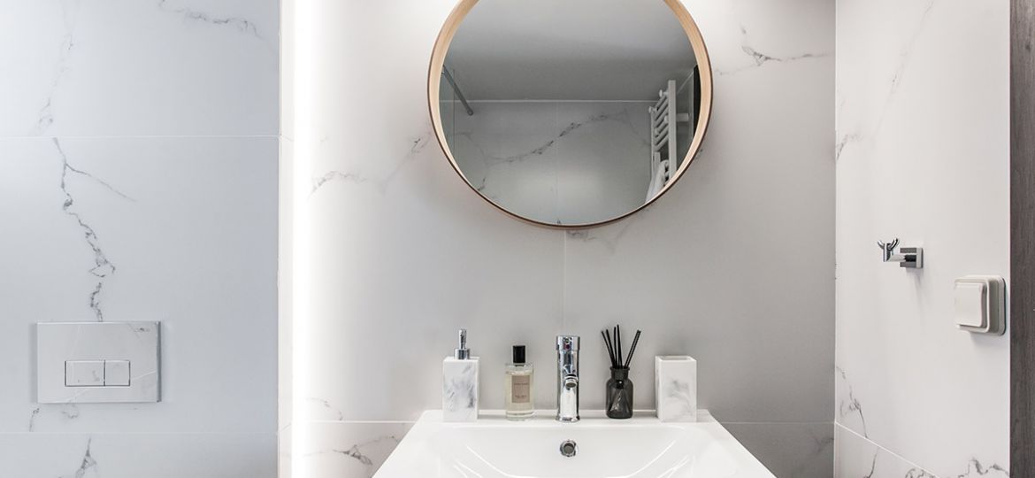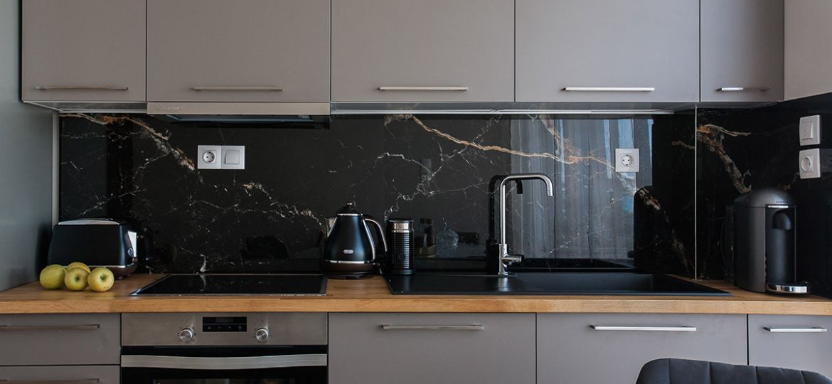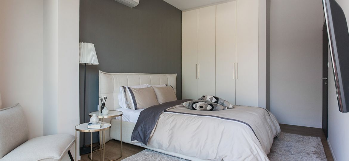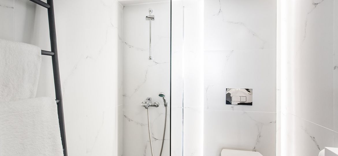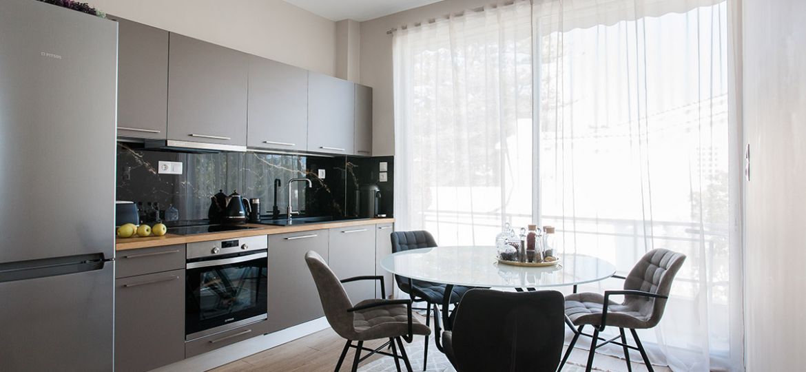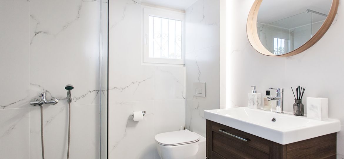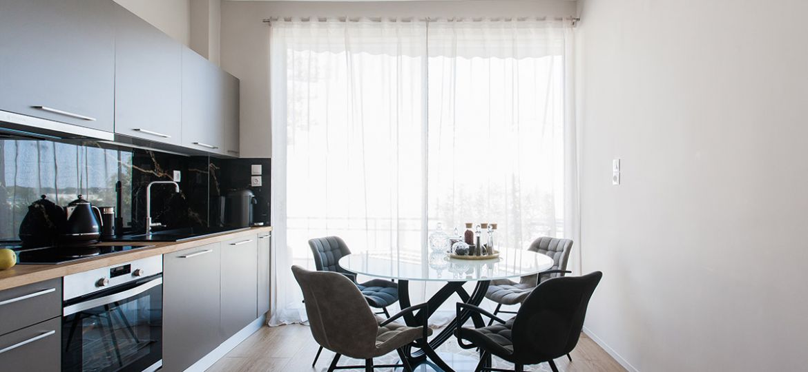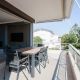 Situated on the first floor, this fully-renovated apartment boasts sophisticated wooden floors, three bedrooms, and a gorgeously designed open-plan living/dining/kitchen area. Showcasing the best of contemporary open-space living, the kitchen/dining/living area is spacious, meticulously designed, and filled with natural light. A sense of minimalistic luxury pervades. The five-star kitchen is a dream to cook in and the wooden dining table – with its sleek black leather seats – a delight to dine on. A superlative sea view is just footsteps away as the apartment’s main balcony adjoins the living space. Therefore, alfresco dining is strongly suggested. As is lounging on the sun beds for your daily dose of vitamin D.