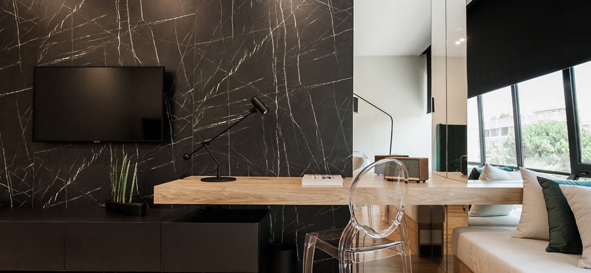 The sleekest part of the suite may just be the spacious floor-to-ceiling black marbled bathroom. Not a care in the world when you’re in that sumptuous walk-in shower. With high-end fixtures, fluffy white towels and top-of-the-line toiletries you will be enwrapped in luxury.
